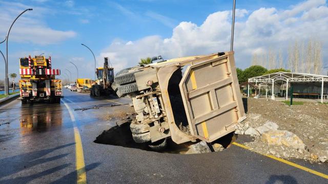 Edremit ilçesi Ülkü Yolu üzerinde hareket eden hafriyat kamyonu, yolun çökmesi sonucu oluşan çukura düştü. Kaza sırasında araç yan yattı.