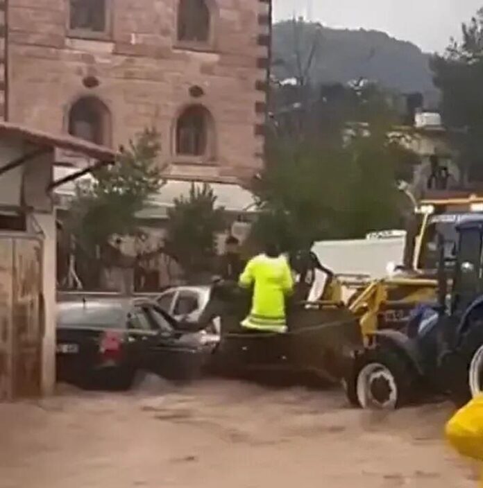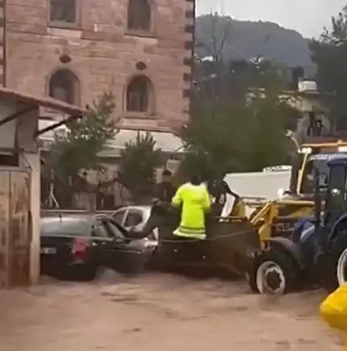 Hatay’ın Yayladağı ilçesinde etkili olan şiddetli sağanak, kısa sürede sele dönüştü. İlçede yollar göle dönerken, araçlarında mahsur kalanlar belediye ekipleri tarafından iş makineleriyle kurtarıldı.